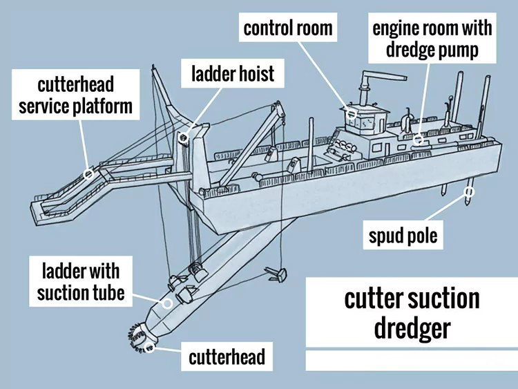 সাকশন এবং ডিসচার্জ সিস্টেম: স্লারি সাকশন হেড, অন-বোর্ড সাকশন পাইপ, মাড পাম্প এবং ডিসচার্জ পাইপের মাধ্যমে নির্ধারিত স্পয়েল এলাকায় পরিবহন করা হয়।